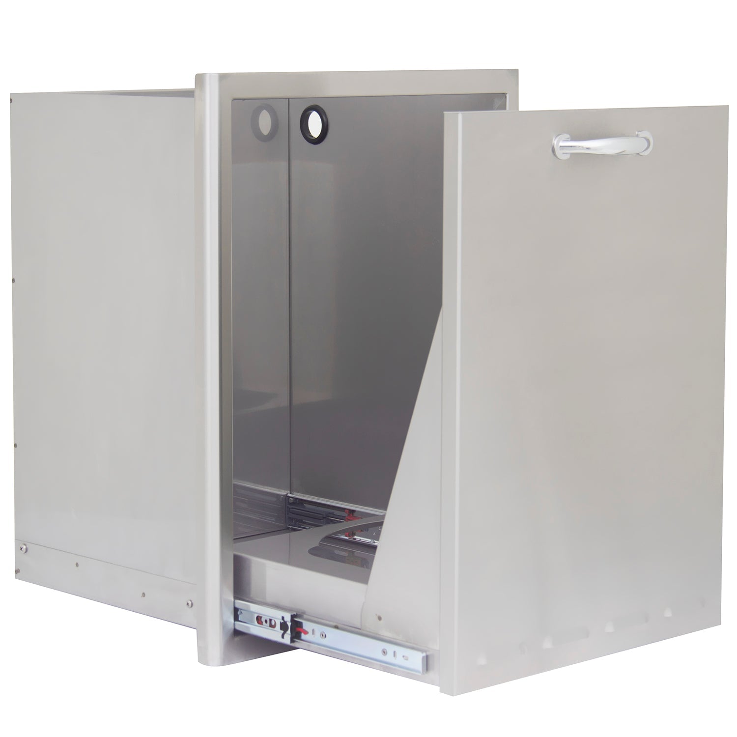This Blaze trash/propane tank storage drawer features commercial grade 304 stainless steel construction to withstand outdoor elements and a unique, completely rounded bevel design that enhances strength and durability. Conveniently store your propane tank for easy access to the cylinder, or stow away your trash bin to reduce clutter in your outdoor area. This quality outdoor kitchen trash/propane tank storage drawer is accented with a curved handle. Blaze storage drawers are the perfect storage solution for any outdoor kitchen!