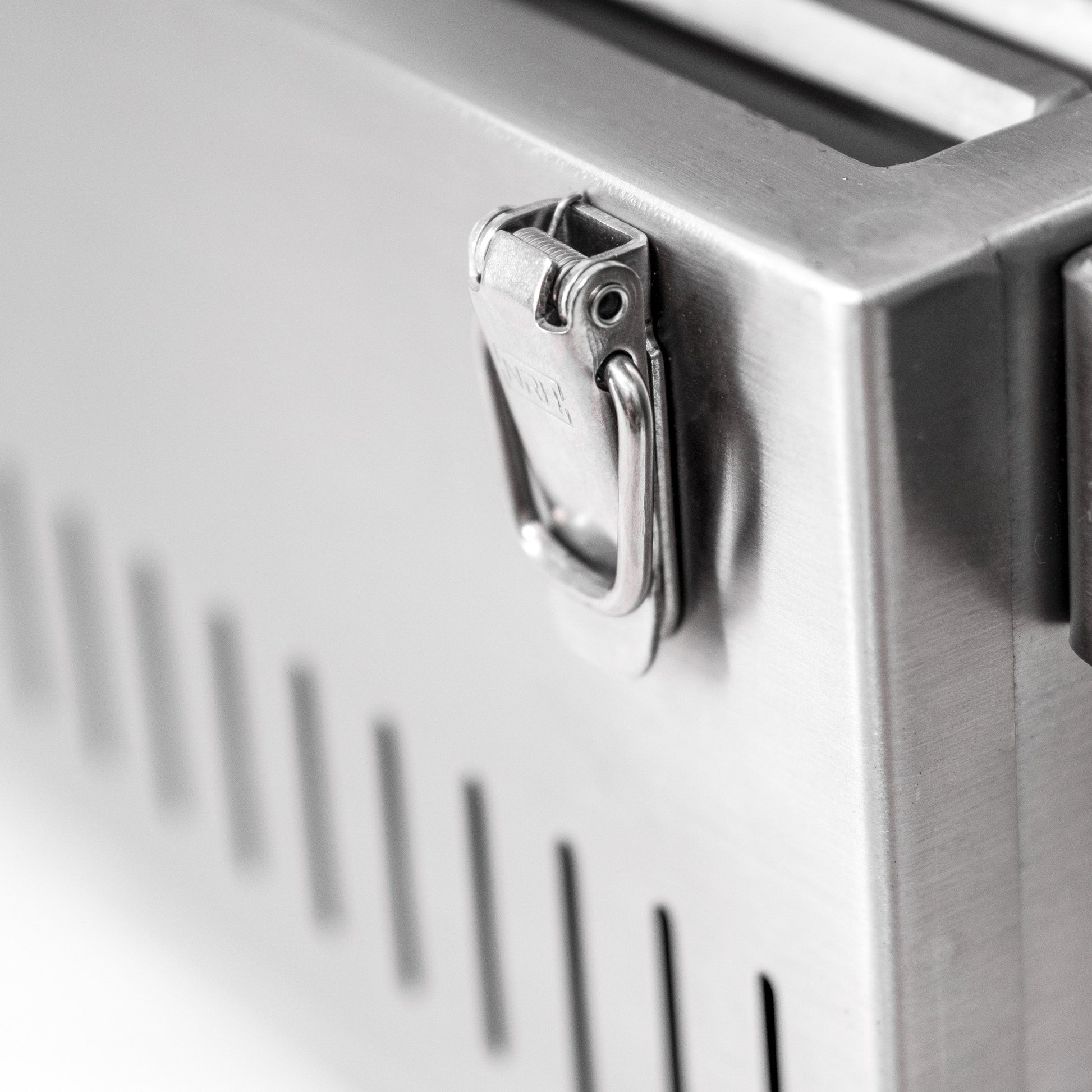 - Two front facing clasps for locking the lid in place during storage or transport.