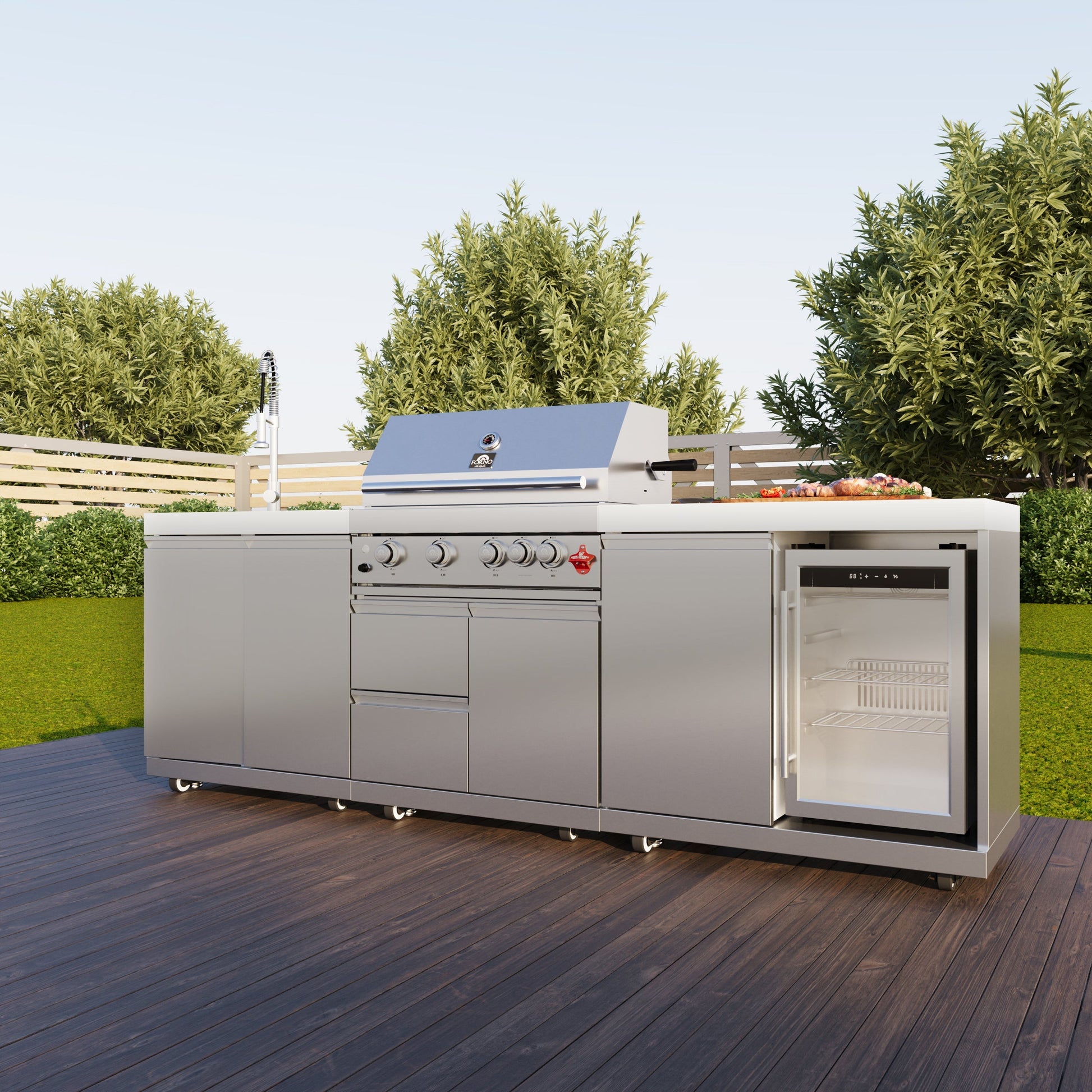 Cook, entertain and chill with this all-in-one 30 inch Outdoor Kitchen set featuring 304 stainless steel burners, sleek black sintered stone countertops, a rotisserie kit, beverage center, storage drawers, halogen lights, and a spacious 28 inch x 18 inch grill surface—built for serious outdoor cooking.