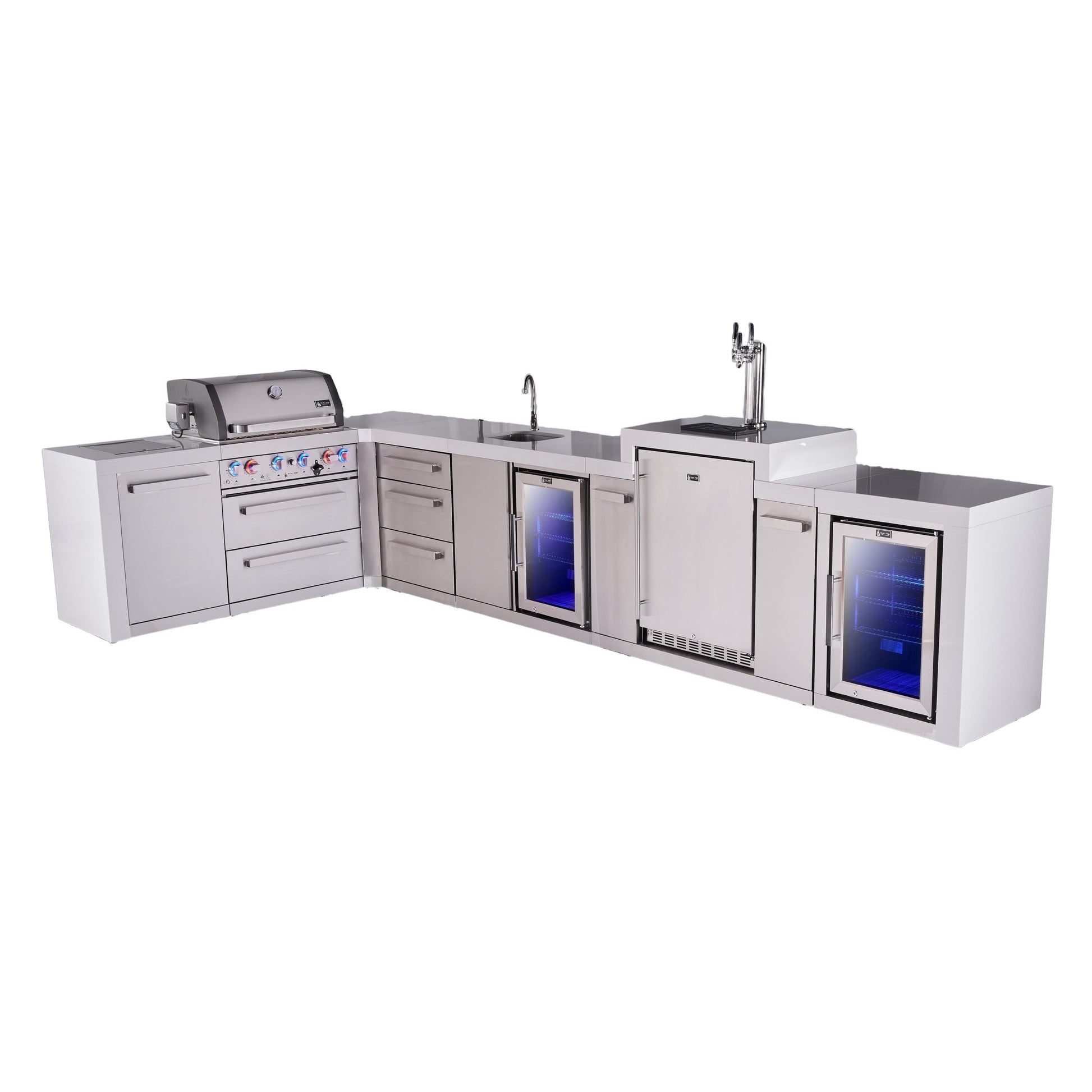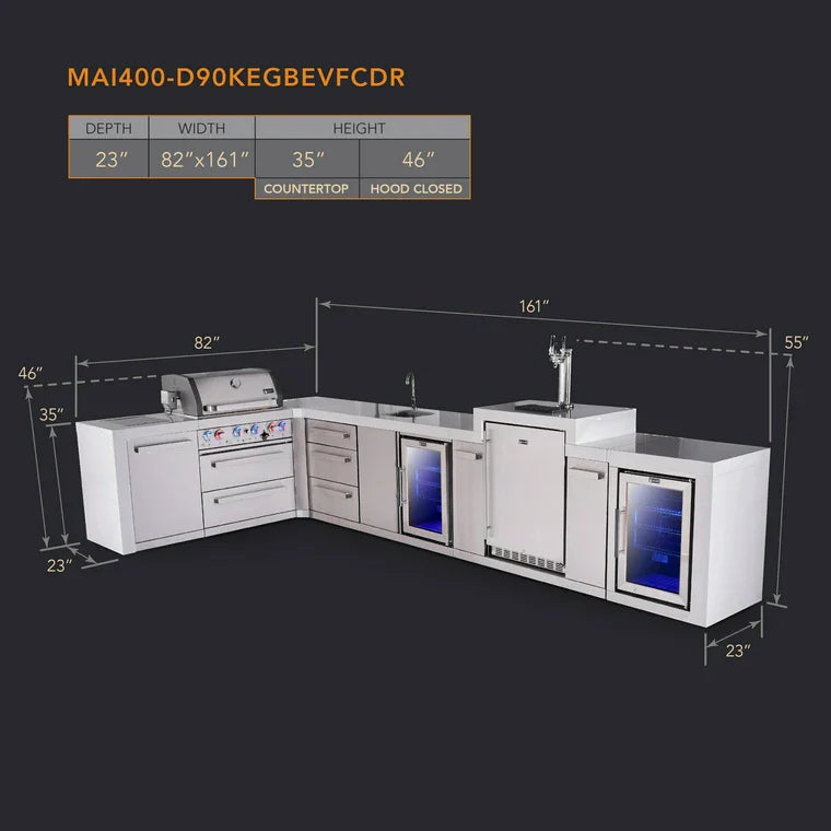 Mont Alpi 400 Deluxe BBQ Grill Island with L-Shape, Beverage Center, Kegerator, Extra Drawer Storage & Fridge - MAi400-D90KEGBEVFCDR