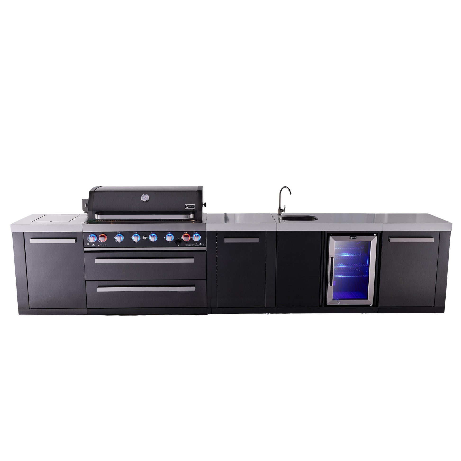 Mont Alpi 6-Burner Black Series Outdoor Kitchen Island With Beverage Center And Extra Storage Cabinet Module - MAi805-BSSBEVXL